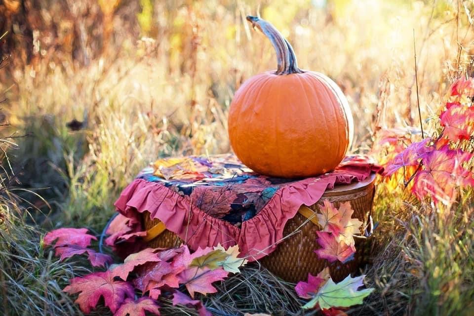 After about twenty minutes we stumbled across a neat little setting; A picnic basket covered by a colorful throw with the most perfect pumpkin sitting on top.